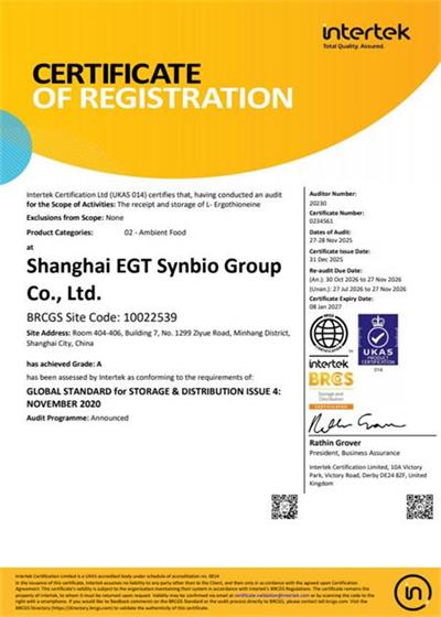 祝賀上海麥角硫因科技有限公司2025年快速通過BRC認證并取得A級證書